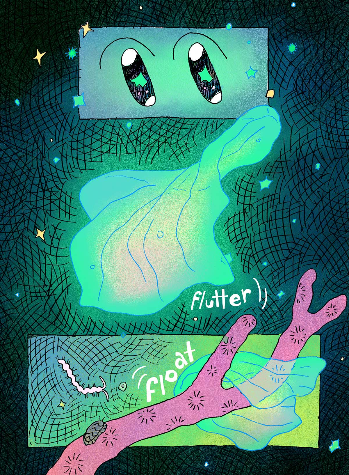 A 26 page full color wordless comic made in 2024 about a sea angel and its friend who come across delicious detritus and go on a little journey to find the source.
